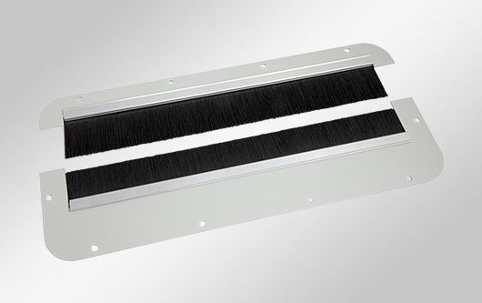 Two-part flange plates, each with two brush strips arranged in opposite directions, enable the routing of cables already pre-assembled with connectors and prevent dirt from entering the enclosure. The flange plates are designed for Rittal enclosures of type AX.