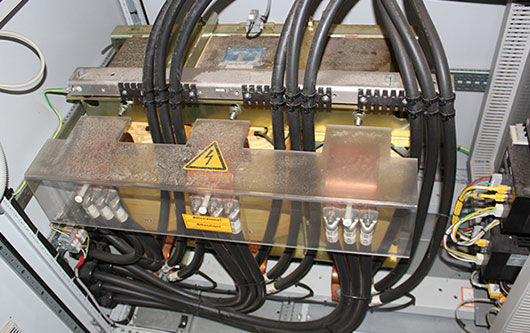 ZL Zugentlastungsleisten: Kabelführung und Zugentlastung mehrerer stromführender Leitungen innerhalb eines zentralen Wechselrichters einer Photovoltaikanlage.