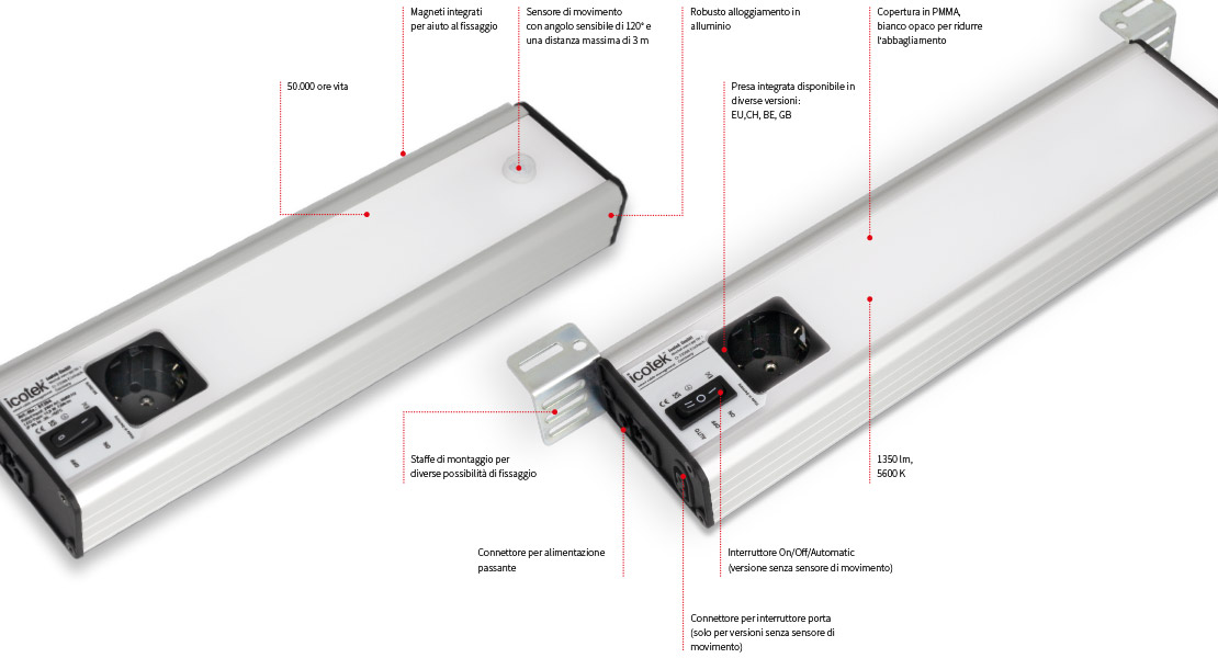 Il LED ad alta resa, illumina con 1350 lumen e fornisce un‘illuminazione bilanciata ed omogenea dell‘a(chǎn)rea. Un altro vantaggio è la possibilità di collegare tra loro più lampade, formando una catena.