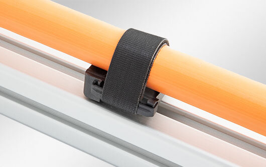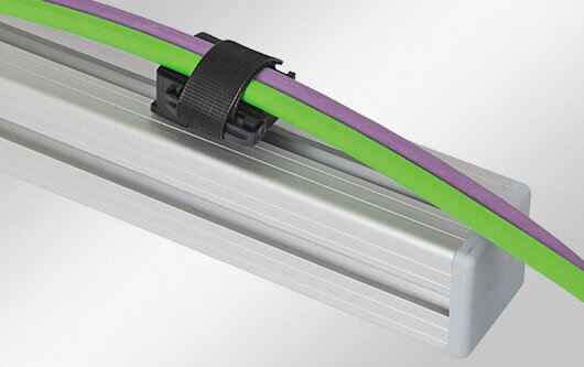 Velcro holder for secure cable routing.  90° twist lock mounting on Bosch Rexroth strut profiles with 8 / 10 mm groove.