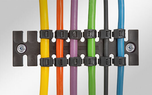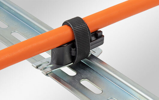 Velcro holder for secure cable routing. Mounting via snap feet on 35 mm top hat DIN rails.