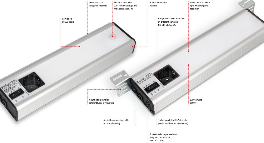 De ALU-LINE-armatuur biedt een ge?ntegreerd stopcontact als praktisch bijkomend voordeel. Deze is beschikbaar in EU-, CH-, BE- of GB-versies.